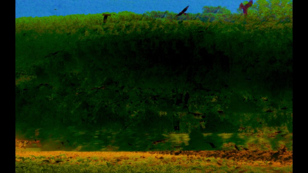 I Think They Don’t See Us Anymore is an introspective exploration of our environment through the shared perspective of a human and a bird. Through chromatic aberration and image distortion, the animal’s vision is interpreted according to its speed and ability to perceive more colors than a human. The viewer, immersed in stretched and unsettling temporalities, engages with a text that invites interspecies empathy